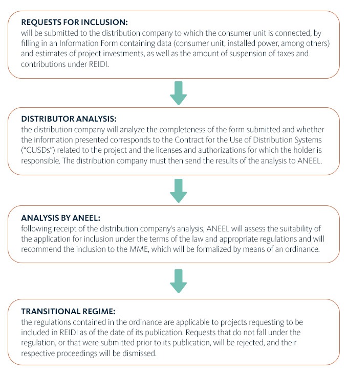 Law No. 14,300/2022, which established the Legal Framework for Distributed Microgeneration and Minigeneration, established in sole paragraph of art. 28 that distributed minigeneration projects will be considered energy generation infrastructure projects in order to be included in incentive and credit programs, such as REIDI.