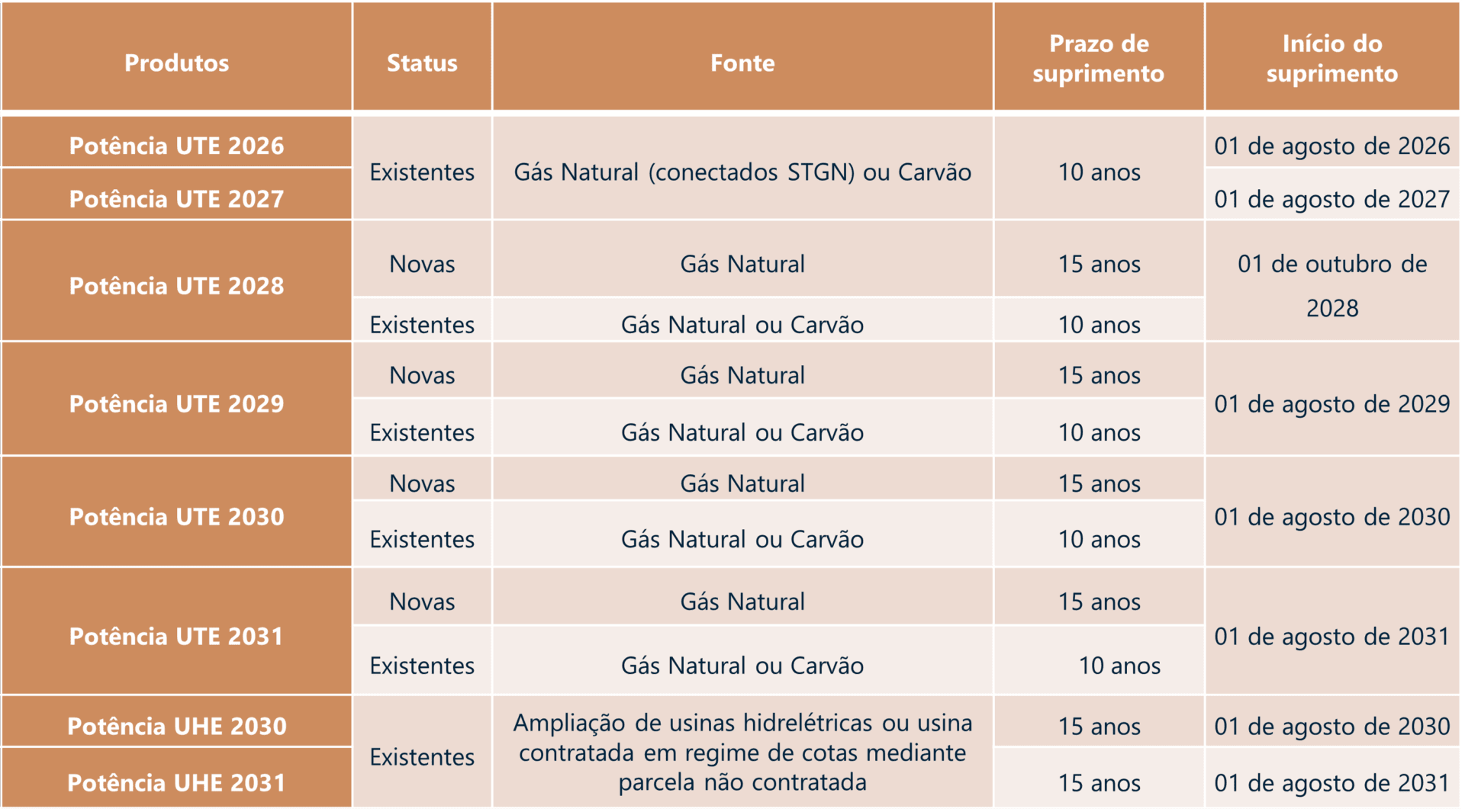 - Restrição dos produtos de 2026 e 2027 a empreendimentos termelétricos existentes a gás natural conectados ao STGN e a carvão mineral.