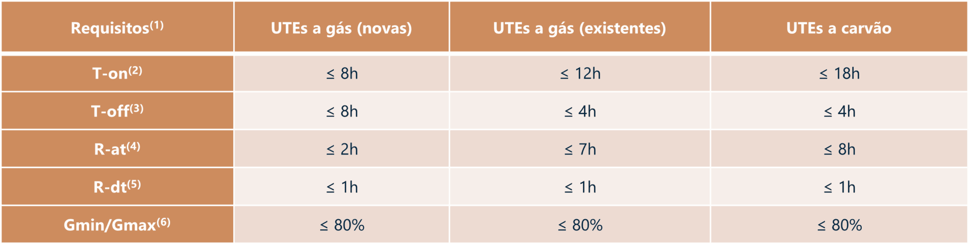 (1) De acordo com a sistemática do Leilão, (i) T on – R at – R dt >= 4 horas; e (ii) T-on, Rat, e Rdt deverão ser maiores ou iguais a 0,5 horas. (2) T-on: tempo mínimo de permanência na condição ligado. (3) T-off: tempo mínimo de permanência na condição desligado. (4) R-at: tempo total considerando a rampa de acionamento e a rampa de tomada de carga (5) R-dt: tempo total considerando a rampa de desligamento e a rampa de alívio de carga. (6) Gmin/Gmax: razão entre a geração mínima e a geração máxima da UTE