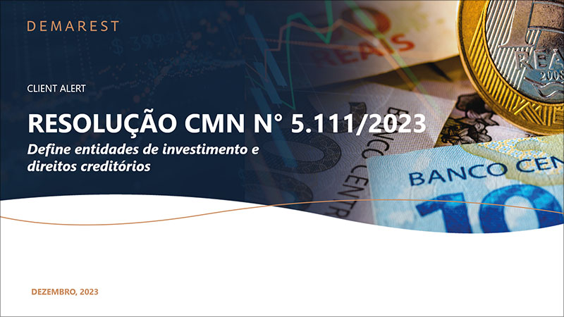 Foi publicada a Resolução CMN nº 5.111, de 21/12/2023, que regulamenta o conceito de entidade de investimento para fundos não sujeitos ao novo come-cotas e fundos com 0% de imposto de renda retido na fonte (“IRRF”) para investidores não residentes. A Resolução também define direitos creditórios, para fins de composição da carteira de Fundos de Investimentos em Direitos Creditórios (“FIDC”).
